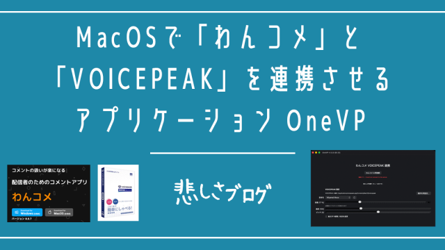 配信MacOSで「わんコメ」と「VOICEPEAK」を連携させるアプリケーション OneVP 2023年12月10日 悲しさ https://kanashisa.blue/wp-content/uploads/2020/07/kanashisa_title.png 悲しさブログ