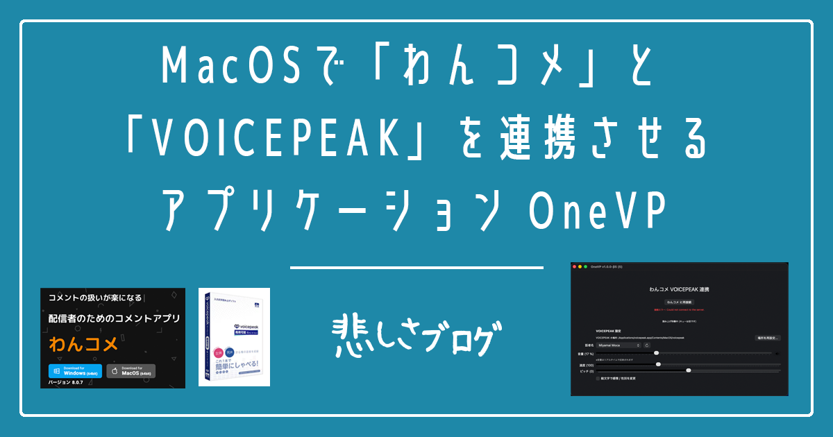「わんコメ」と「VOICEPEAK」を連携させるMacOS専用アプリケーション OneVP を開発しました。下記URLからダウンロードしていただき、ご利用ください。