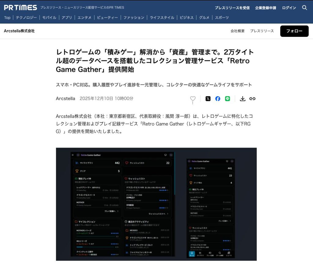 レトロゲームのコレクションを管理するアプリやWEBサービスはすでにいくつか存在していました。そして、衝動的に開発を始めた直後に「Retro Game Gather(Arcstella)」(以下、Retro Game Gatherさんと呼びます)というサービスが2025年12月に始まったというニュースが飛び込んできました。
