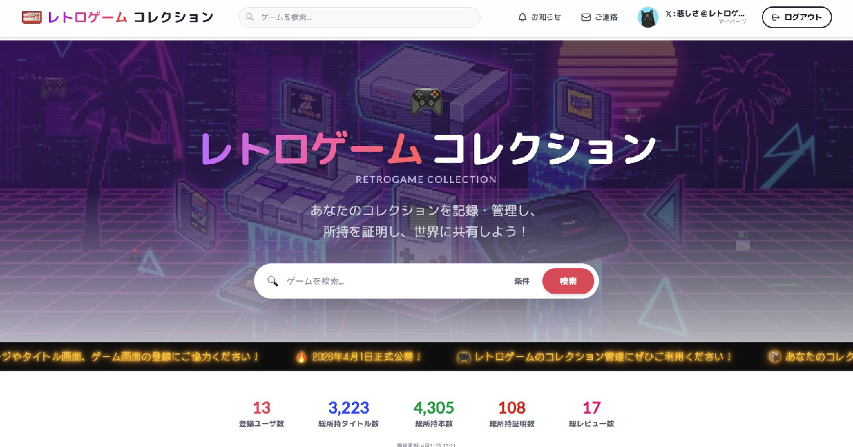 2026年4月1日に「レトロゲームコレクション」( https://retrogamecollection.org/ )というWEBサービスを正式公開しました。