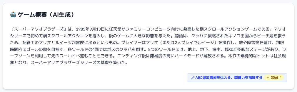 AI全盛ですから、なにかしらAIの機能を盛り込みたかったので、ゲーム概要を書かせるというのをAIにやらせてみようと思いました。最初は無料のAIでやらせてみたのですが、思いのほか品質が低かったので、ちょっと頑張って有料のAIに書かせました。ただ、それでもダメダメな文章を書いてくることがあるので、AIにダメ出しをして書き直させるという機能をつけました。AI利用に関してはこれ以外にも色々と実装したい案はありますが、コストとの兼ね合いで色々と悩み中です。
