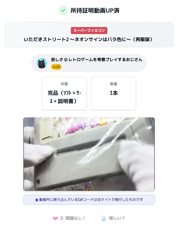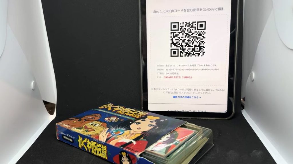 「このサービスを公開形式かつ無料でしようできるようにする」と決めたとき、最初に懸念したのが「荒らし対策」でした。持ってないものを「持ってる」と嘘をつかれてしまうと、このサービスの見え方が大きく変わってしまうからです。なので、所持を証明できる機能を最初に実装しようと思っていました。その証明の方法ですが、利用者に所持証明動画をYouTube上にアップロードしてもらい、レトロゲームコレクションでその動画内容の検証を行い、その動画が本人がアップロードしたものと認めることができた場合に「所持証明動画UP済」のマークを付けるという機能です。動画の検証方法ですが、レトロゲームコレクションでアカウント本人しか入手することができないQRコードをその動画に映り込ませ、その動画内にそのQRコードが正しく映り込んでいるかを検証しています。